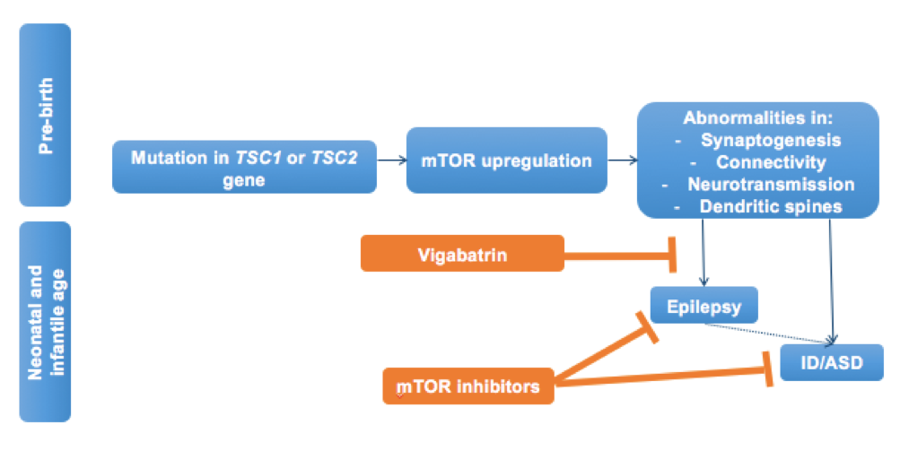 Figure 2: Summary of the cascade of events resulting from the mutation of the TSC1/2 genes and taking place already during fetal life. Poorly controlled seizures are significant risk factors for adverse neurobehavioral and neurocognitive outcomes. Pre and post epileptic windows for secondary prevention are theoretically possible in infants with TSC. The early treatment with vigabatrin might reduce or suppress seizures thus decreasing the risk of subsequent ID/ASD; while mTOR inhibitors might directly act on both seizures and behavioral phenotypes.