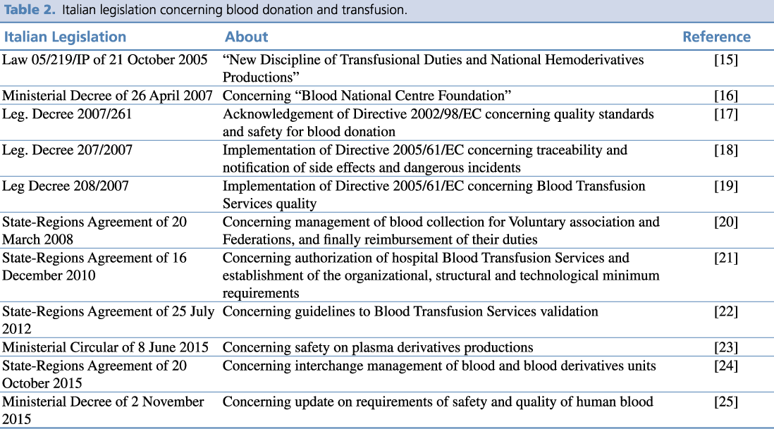 Finally, a Ministerial Decree (MD) updated the requirements on safety and quality of human blood. This MD established all the procedures that have to be followed in the different phases of blood donation and blood transfusion, from information to eligible donors to blood transfusion procedures and its possible adverse events.25