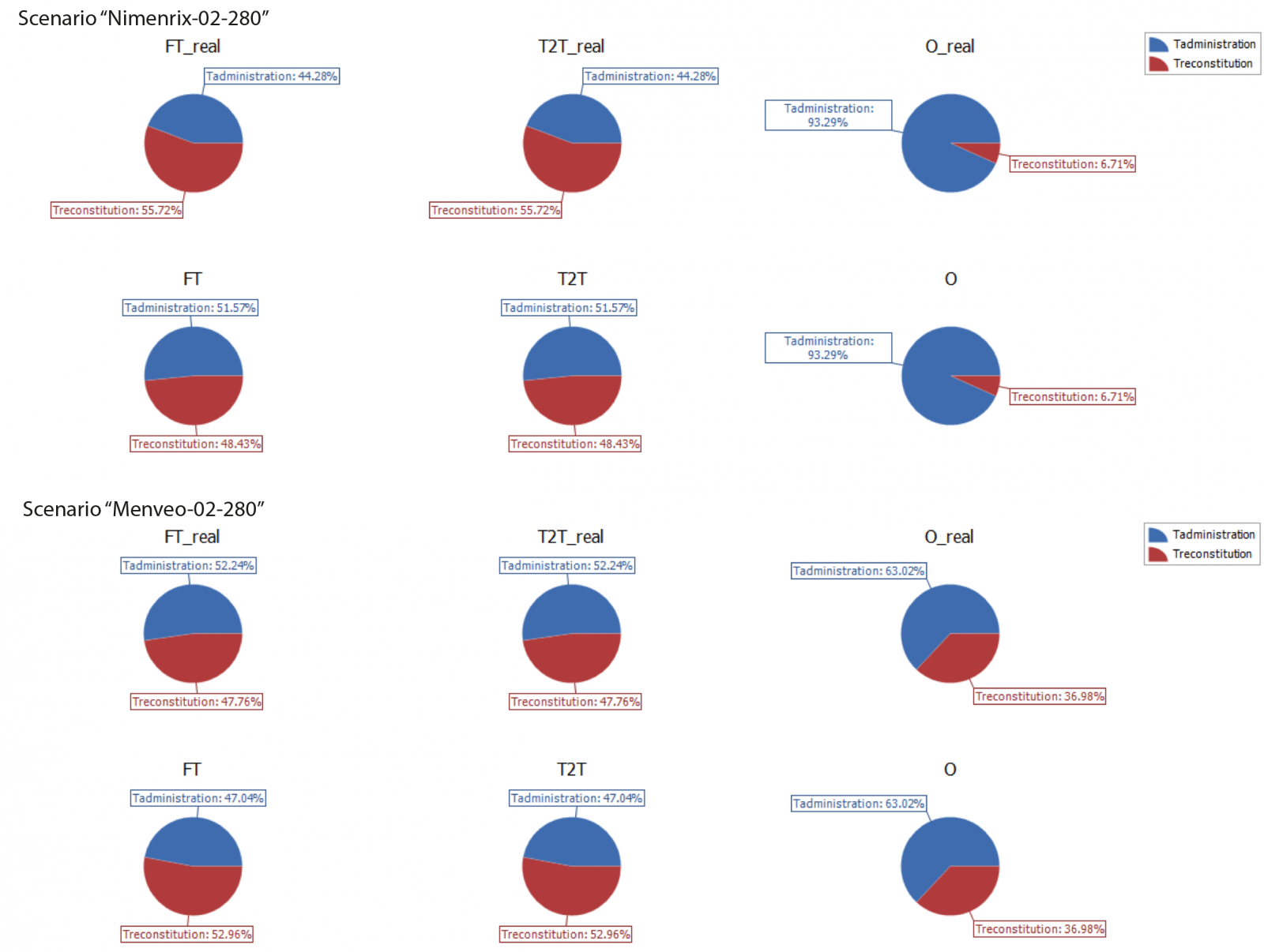 Such free time percentages (shown in Figure 10) correspond to an average time to target (T2T_real) of 280.3 and 334.1 minutes when the vaccine is Nimenrix® and Menveo®, respectively (Figure 11). Thus, the time saving can be simply evaluated by difference with the session duration (340 minutes).
