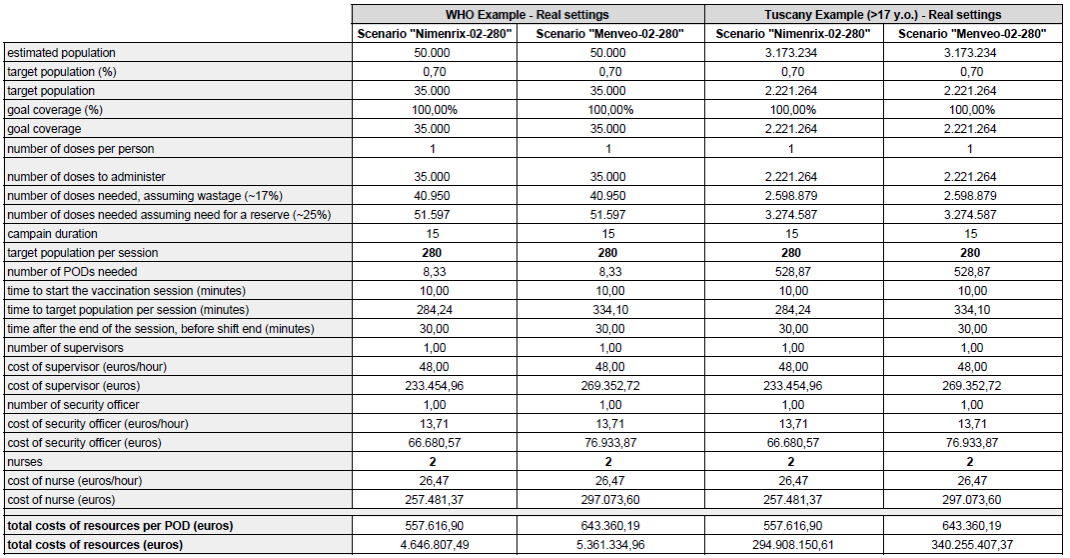 Figure 14. Examples of economic implications. In case of meningitis epidemic and according to recommendations by the WHO, operators of each involved vaccination POD can be temporary hired to cover the target population within 2 weeks from the start of the vaccination campaign. The free time (if any) could be use to close the POD itself in advance for having a cost saving (assuming operator unitary costs per hour).