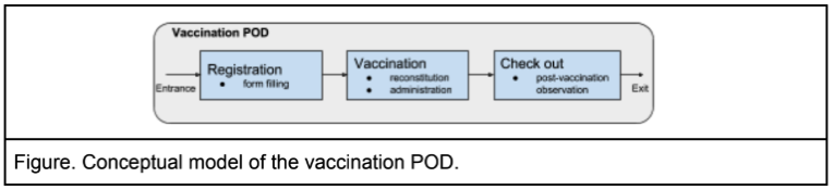 A top-down method is used to construct the conceptual model of the vaccination POD. Areas and zones of the vaccination POD are identified from WHO guidelines (Figure 4).2,8