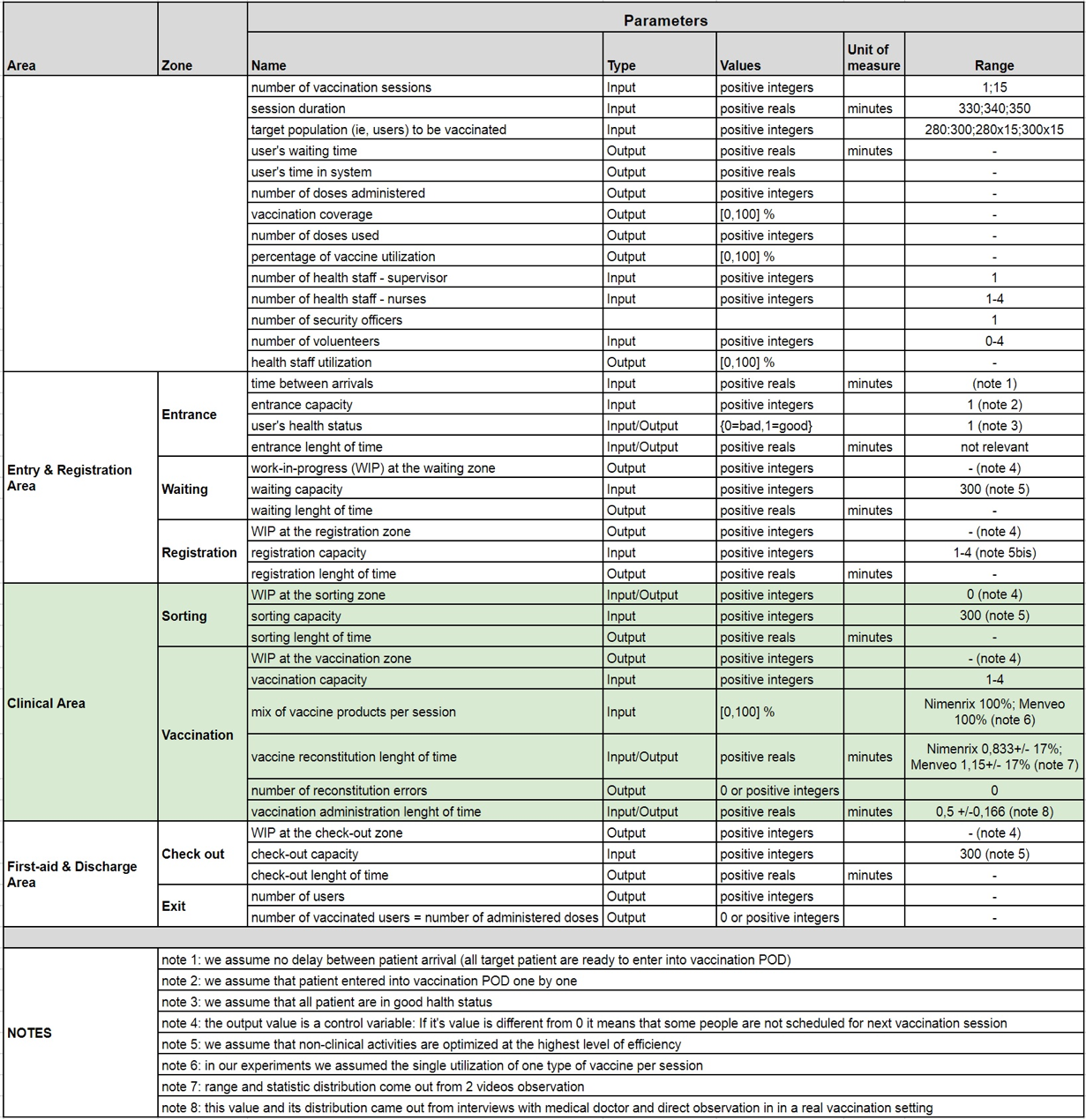 In this study, as we are interested in measuring the impact of the ease-of-use of two different meningococcal vaccines available on the market in Italy, namely Nimenrix® and Menveo®. We compare simulated performance of ideal POD (with a complete vaccination team according to WHO) and real world POD (with a reduced vaccination team) providing only one type of vaccination to predefined target patients (assumed to be present at the beginning of the vaccination and in good health). By adopting a vaccination session, easy under an organisational point of view, non-clinical activities of the POD can also be optimised at the highest level of efficiency. This could be considered as a limit of the study. However, if this first impression is exceeded, such an organisational model gives to the vaccination POD the ability to operate efficiently, both in emergency situations as well as under normal conditions, also with relevant time and cost savings by leveraging the ease-of-use of the adopted vaccine. The quality of the service can also be improved more easily by engaging patients and health workers in the study of relevant aspects of the single specific vaccination.20-21 Due to lack of usable evidence from literature or observable vaccination POD which operate “under the same condition” hypothesised, the results of the study do not take vaccine reconstitution errors or possible vaccination side effects into consideration.22