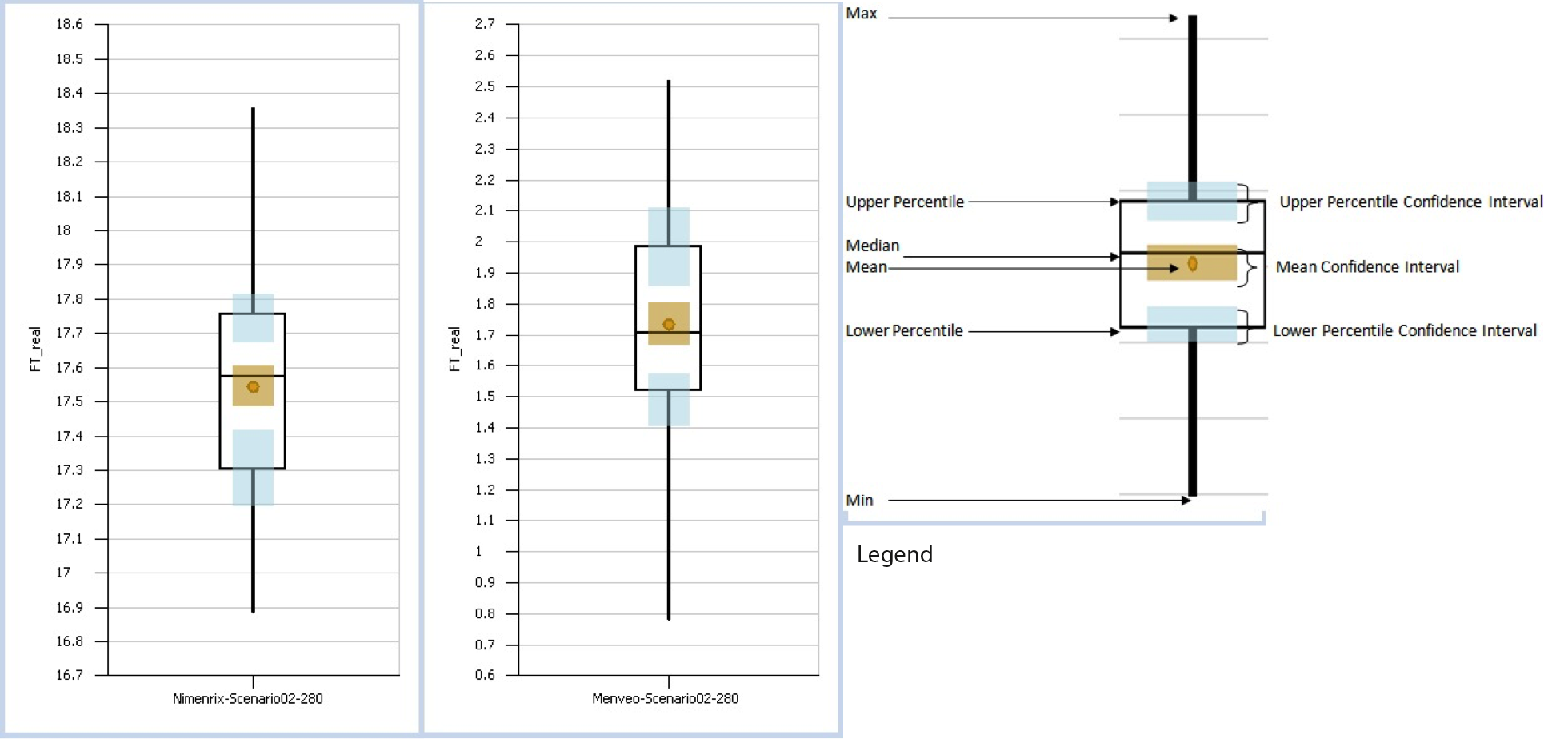 The first two scenarios show that with a clinical area capacity of two units, a target population per session of 300 people, as stated by WHO, cannot be served by using the Menveo® vaccine in real world vaccination POD. Thus, the comparison of two vaccines can only be performed by decreasing the target to 280 people. Having established this target, for the real world vaccination POD the average free time percentage (FT_real) is about 17.54% and 1.73% for Nimenrix® and Menveo® respectively (see Figure 9 at column FT_real, scenarios Nimenrix-Scenario02-280 vs Menveo-Scenario02-280). More specifically, the next two figures (Figure 10 and Figure 11) show SMORE (Simio Measure of Risk & Error) plots including FT_real minimum, maximum, mean, median (with upper and lower percentile) and confidence intervals.