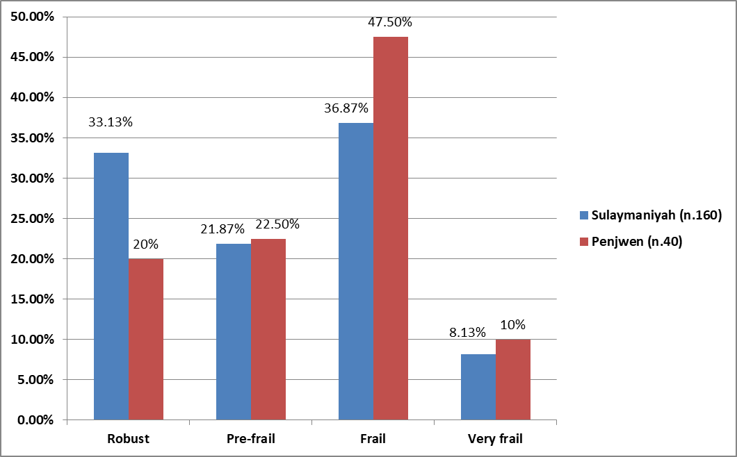 Regarding comparing data on the degree of frailty between Sulaymaniyah vs. Penjwen, the share of robust individuals was (20% in Penjwen vs. 31.13% in Sulaymaniyah), (22.5% in Penjwen vs. 21.87% in Sulaymaniyah) were in the pre-frail class, (47.50% in Penjwen vs. 36.87% in Sulaymaniyah) were in the frail class. The “very frail” class accounted for (8.13% of older persons in urban areas vs. 10% in rural areas).