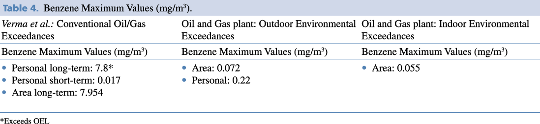We compared the Verma et al. paper to the two surveys at the Oil and Gas center for benzene (Table 3). Specifically, we were interested in determining the percentage of benzene samples over the occupational exposure limit (OEL) of 3.2 mg/m3 or 1 ppm. Personal samples for the Verma et al. study found 0.5% of samples over the OEL and 13% of area samples over the OEL. We also compared the Benzene maximum values from the Verma et al. study to the first two Oil and Gas center (Table 4). The maximum values for personal long-term samples were 7.78 mg/m3 and the maximum value for area samples was 7.9 mg/m3. Both of these values are above the occupational exposure limit for benzene. For the indoor and outdoor surveys at the Oil and Gas center plant, neither the outdoor area maximum value of 0.072 mg/m3 nor the personal maximum value of 0.22 mg/m3 were over the OEL. Similarly, the indoor area maximum value of 0.055 mg/m3 was below the OEL.